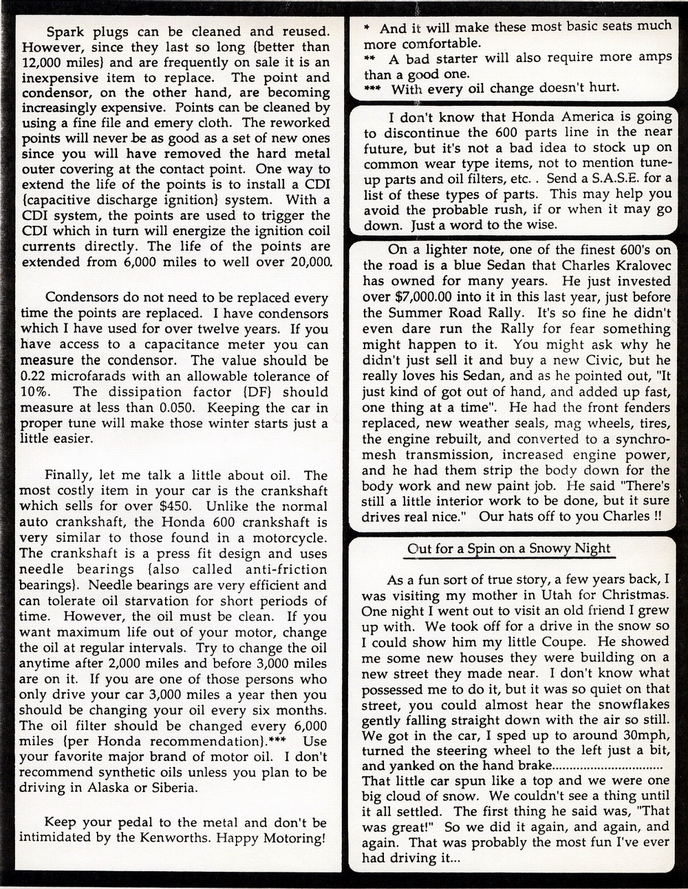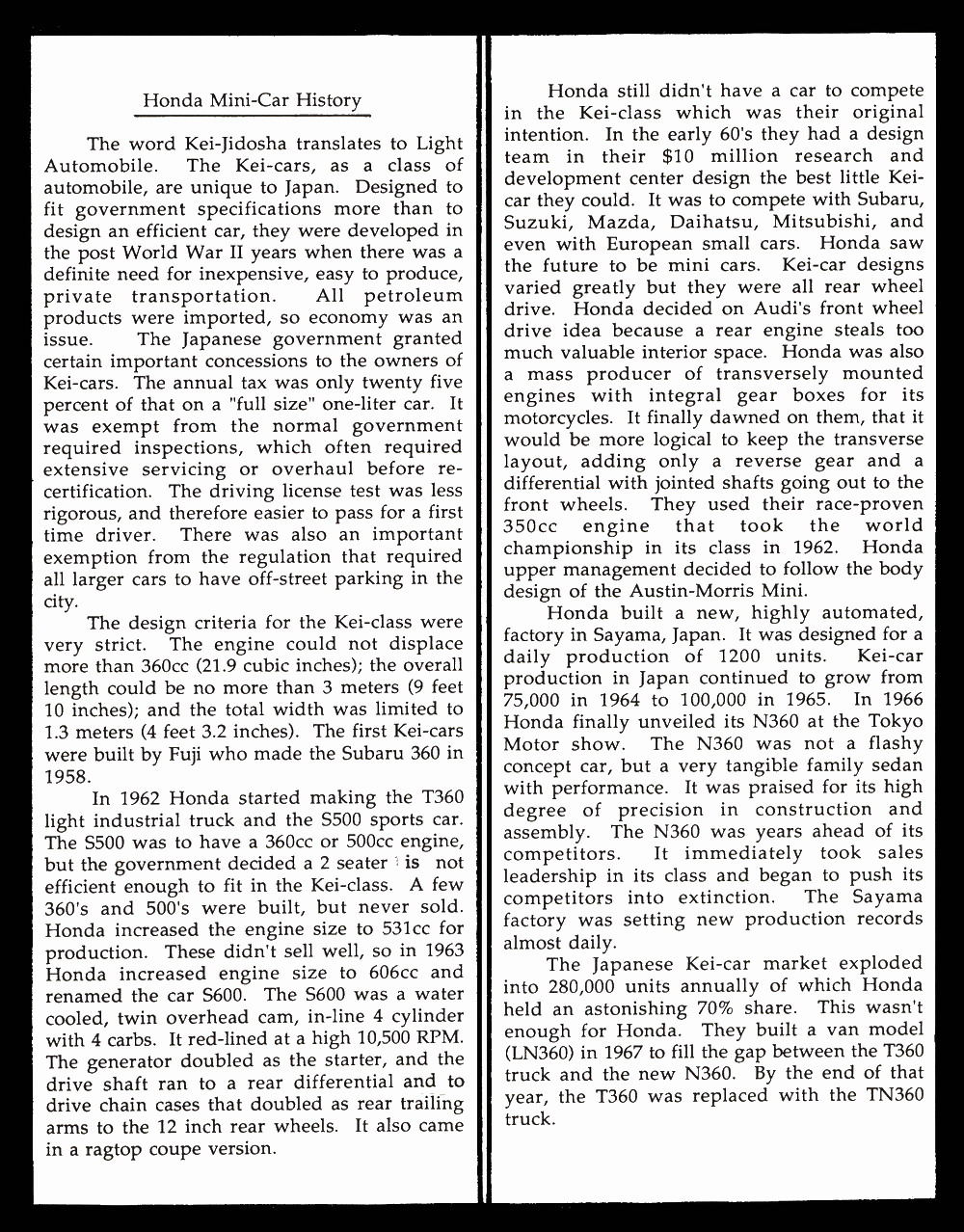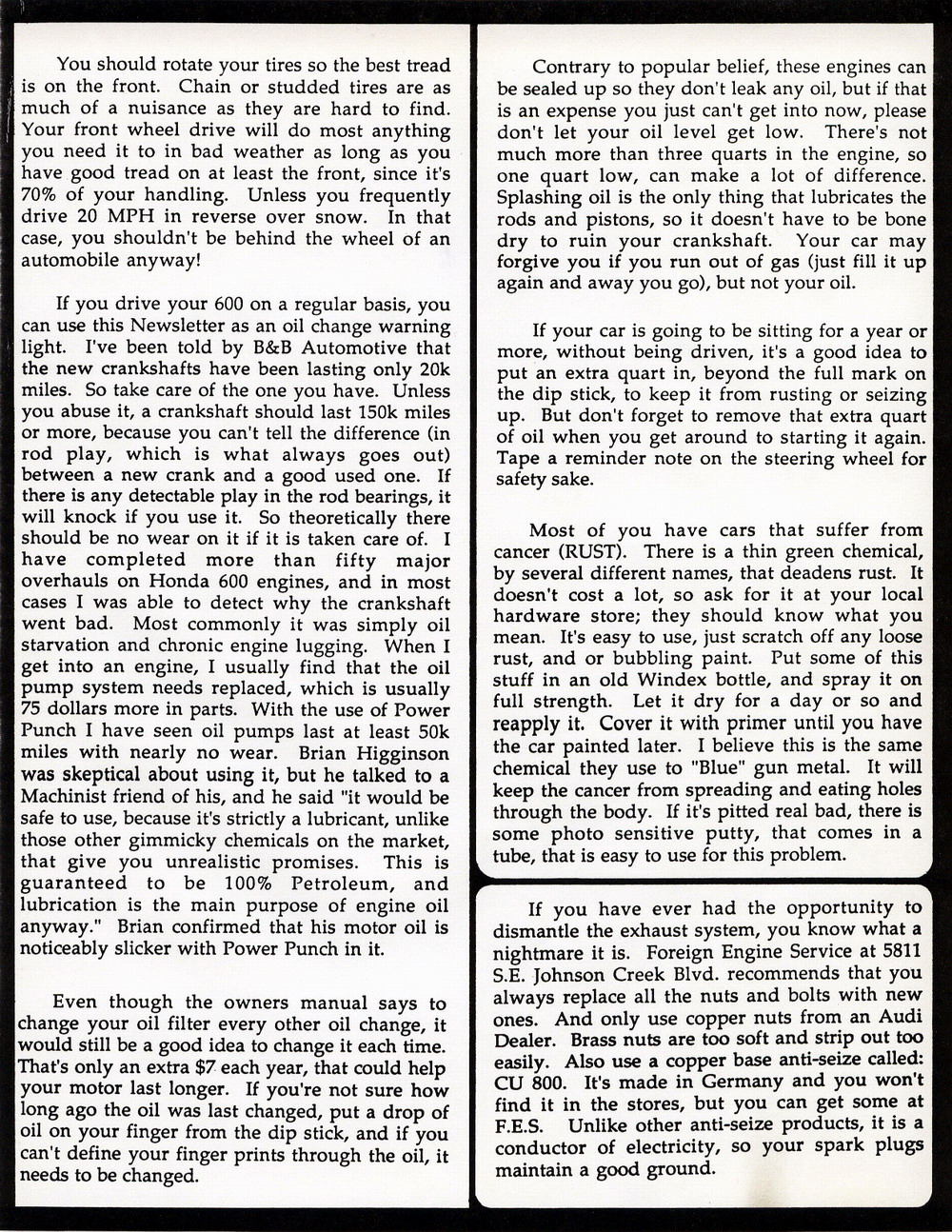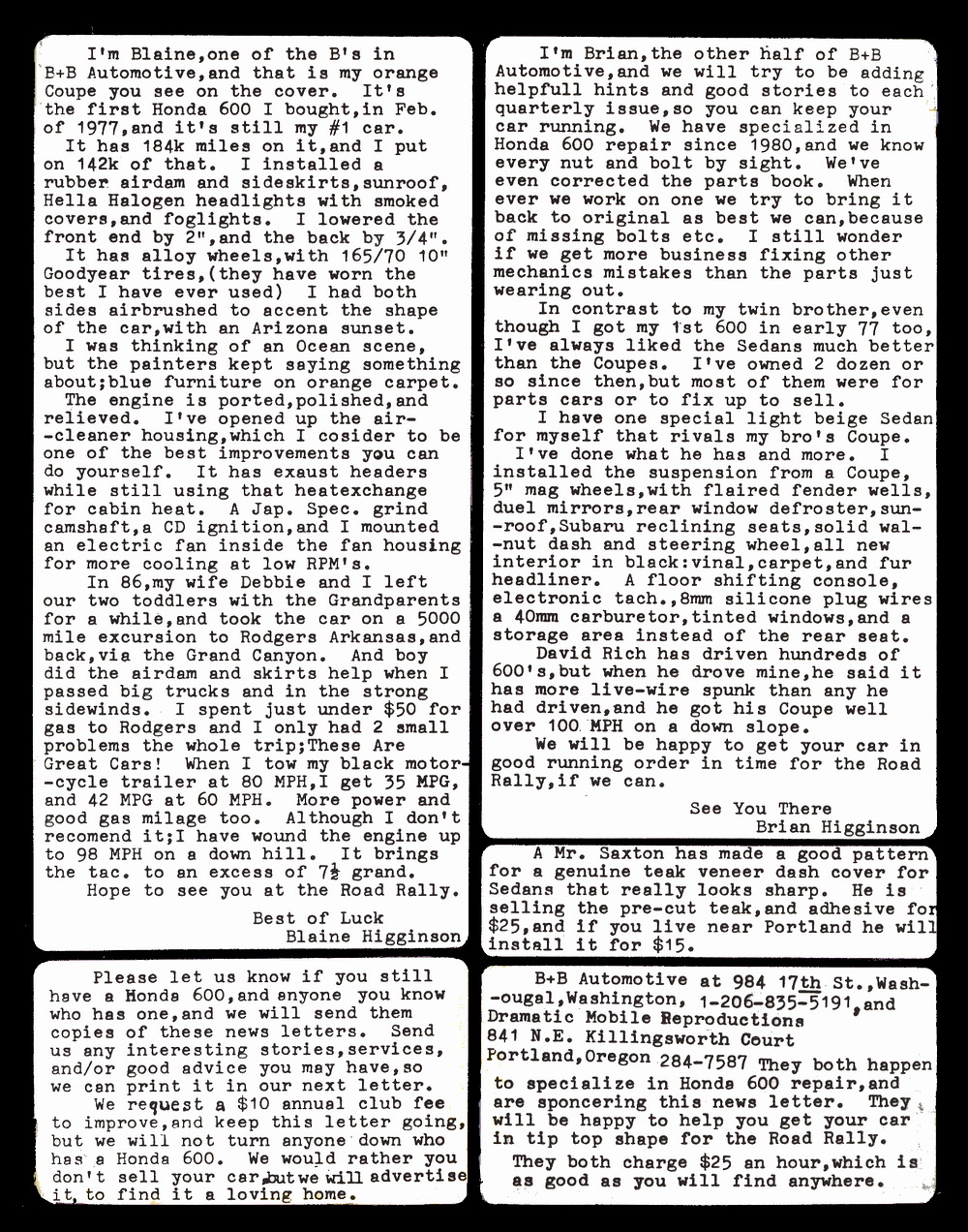 Here is a copy of the first news letter I published. Click on these images to see the full screen images to read. I tried to share good information about the care of these cars. I wanted to involve all those who are into these littl cars, even if they are my competition. I hosted Blaine's car on the cover, who runs B&B Automotive. They had been working on these cars longer than I had begun in late 1981. |