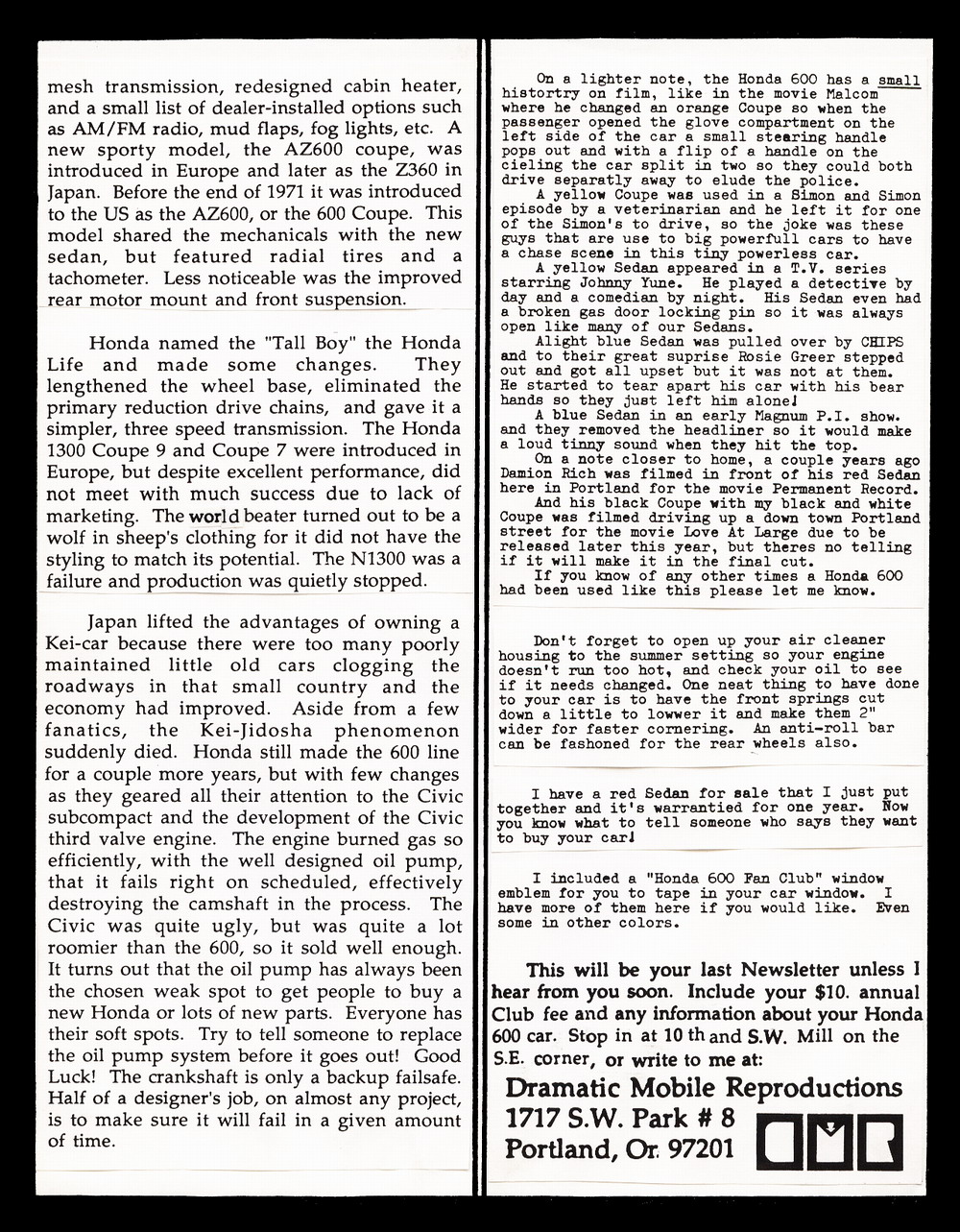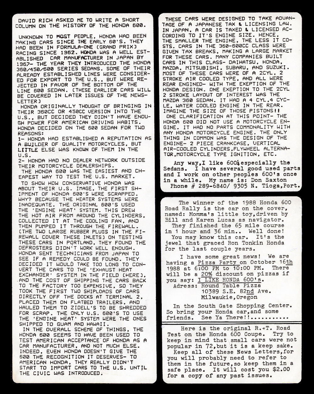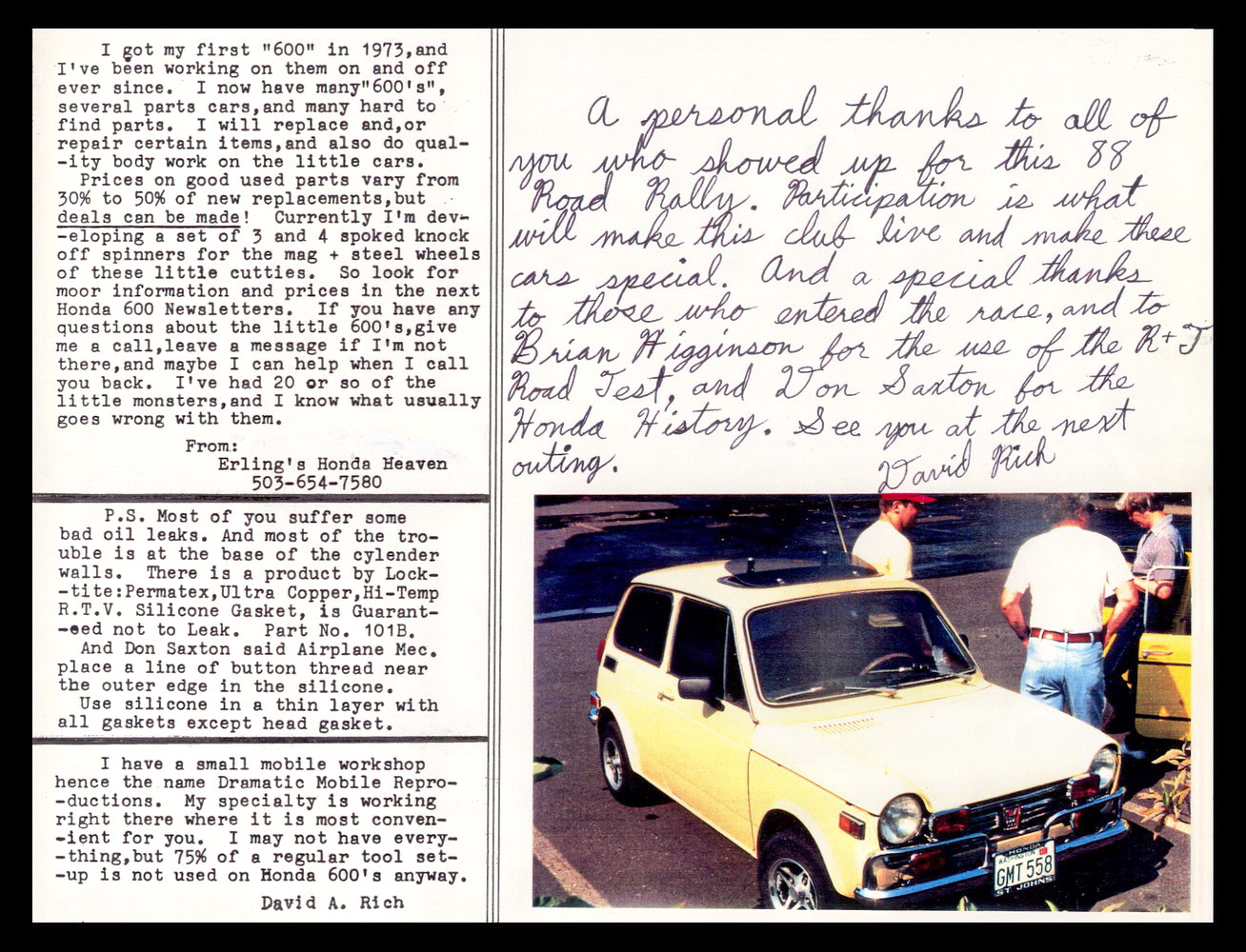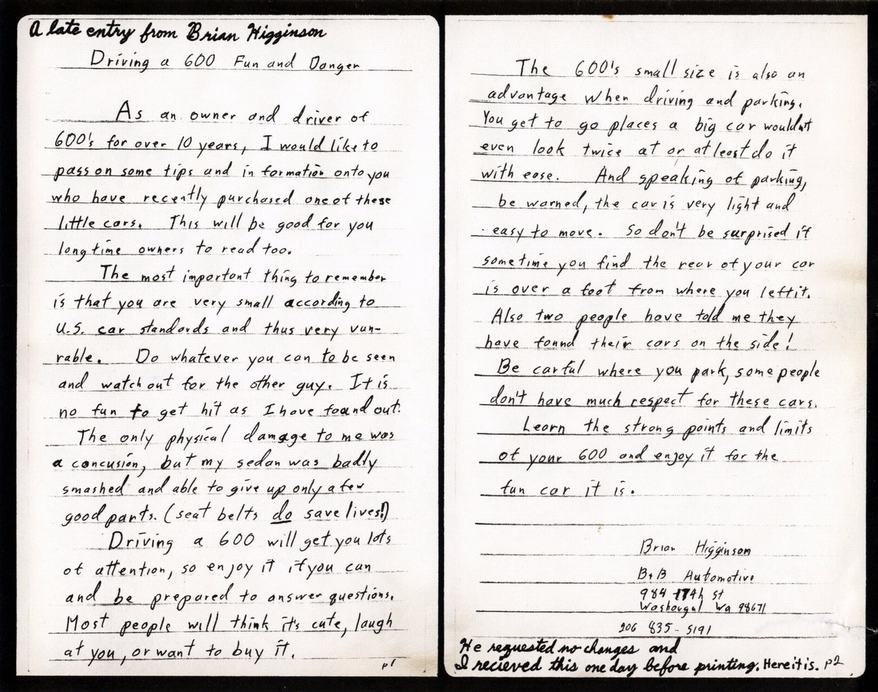 Here is a copy of the first news letter I published. Click on these images to see the full screen images to read. I tried to share good information about the care of these cars. I wanted to involve all those who are into these littl cars, even if they are my competition. I hosted Blaine's car on the cover, who runs B&B Automotive. They had been working on these cars longer than I had begun in late 1981. |