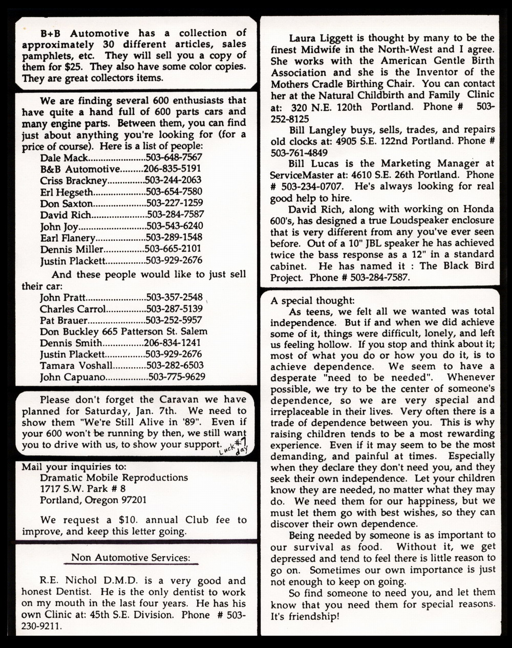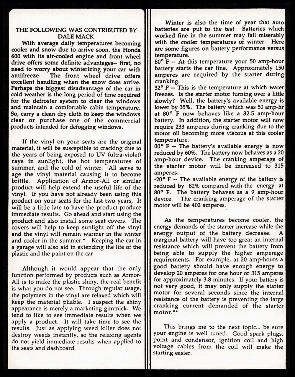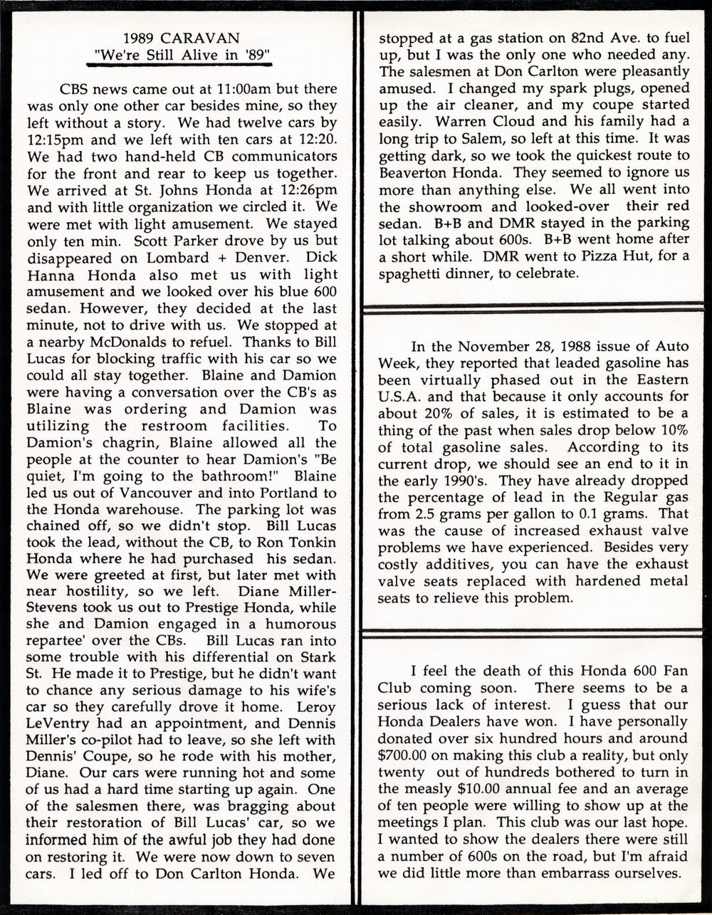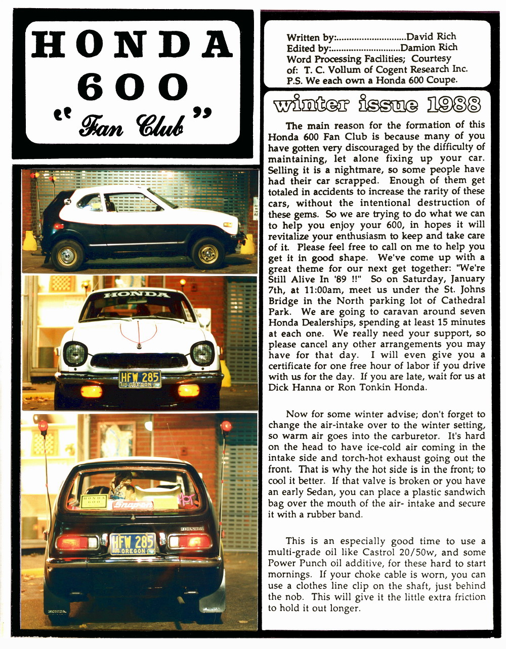 Here is a copy of the first news letter I published. Click on these images to see the full screen images to read. I tried to share good information about the care of these cars. I wanted to involve all those who are into these littl cars, even if they are my competition. I hosted Blaine's car on the cover, who runs B&B Automotive. They had been working on these cars longer than I had begun in late 1981. |